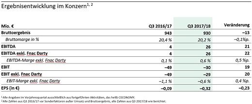 Das Finanzergebnis verringerte sich im dritten Quartal um 142 Mio. Euro auf –154 Mio. Euro.  Dies ist nahezu vollständig auf die negative Kursentwicklung der Aktie der Metro AG zurückzuführen. Diese führte zu einer weiteren Wertminderung der rund 10-prozentigen Metro-Beteiligung auf 10,59 Euro je Stammaktie und 11,95 Euro je Vorzugsaktie. Die Wertminderung belastete das Finanzergebnis von CECONOMY mit rund 138 Mio. Euro. Das Ergebnis je Aktie (EPS) verringerte sich auf –0,32 Euro, nach –0,09 Euro im Vorjahr. Insgesamt wurden damit im Verlauf des Geschäftsjahres gemäß den IFRS-Bilanzierungsrichtlinien 268 Mio. Euro auf die Metro-Beteiligung abgeschrieben. Die Wertminderung hat keinerlei Auswirkungen auf die Ziele für das Geschäftsjahr 2017/18.